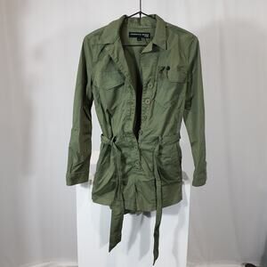Cotton-blend romper featuring a point collar, long sleeves, and a self-tie waist. This style is finished with side on-seam pockets and a button-front closure.