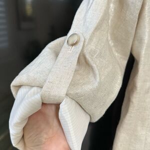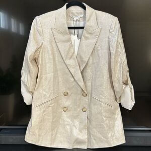 Features The Parineti is a VB favorite, now updated in a luxe Italian linen blend. Expertly tailored, this double-breasted silhouette features lightly padded shoulders, slit pockets and a relaxed, elongated silhouette. The neutral hue makes this a versatile favorite while the subtle metallic threading adds an unexpected element of shine. Roll up the sleeves with the built-in tabs for a more casual look, and pair with your favorite summer dress-classic VB style.