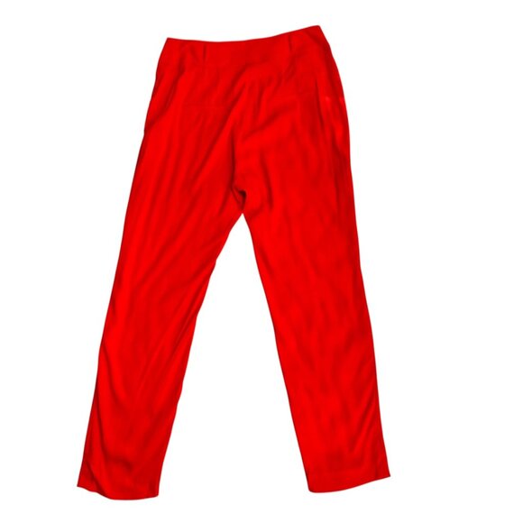 These Veronica Beard trousers offer a blend of elegance and comfort, crafted from a high-quality viscose blend. Their striking red color adds a bold statement to any wardrobe. Manufactured in the USA, these trousers are designed for a professional look, making them suitable for formal settings or the office.