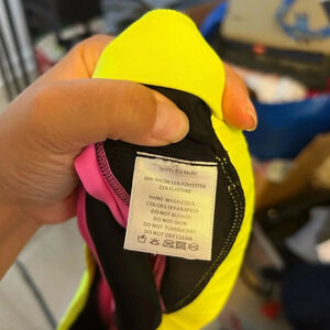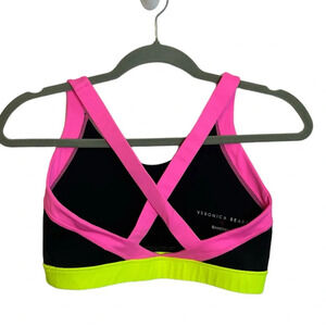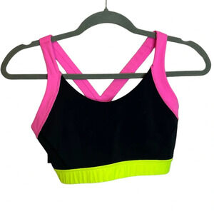 Pre owned excellent condition. Worn nice. Adorable black sports bra with neon pink and neon yellow trim. Adorable criss-cross back. WOMENS size medium. This bra does not have pads. Length 12” Armpit to armpit 15”