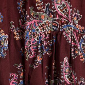 Allover paisley print. Partial lining. Approx. L- 34 1/2". Slipover style.