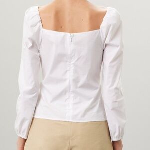White poplin (98% cotton, 2% spandex). Top. Long sleeves. Sweetheart neckline. Back zipper closure. 24.5" from shoulder to hemline. Imported.