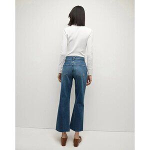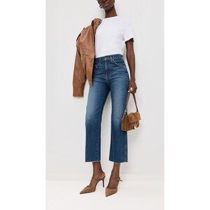 Classic straight-leg jean with a raw hem. Made in LA from premium stretch cotton, this high-rise silhouette is a brand favorite. The versatile slightly cropped length works well with flats and heels alike. The wash is 'evening dusk' a vintage medium blue with distressing at the pockets and frayed hems. Five pocket styling, zip fly, belt loops. 99% cotton/1% polyurethane, machine wash. Excellent condition!
