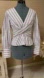 Chic wrap blouse with purple and white stripes. Features a stylish V-neck and long sleeves. Perfect for versatile styling.