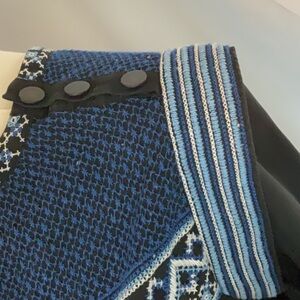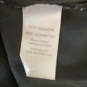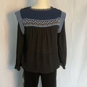 Fantastic Veronica Beard 100% silk top. Black base with beautiful embroidered top of white and 2 shades of blue. Black buttons line top of shoulder. Accentuated shoulder detail. Drawstring bottom. Loose fitting.