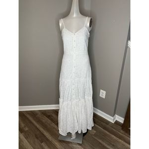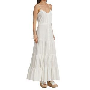 Veronica Beard's Alondra Maxi Dress features a button-front placket and tiered silhouette. It is crafted of an eyelet fabric lending timeless elegance to the piece.