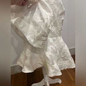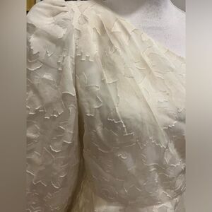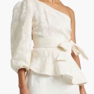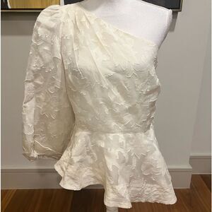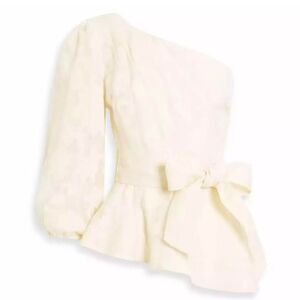 Veronica Beard Fete blouse in ecru this is brand new with the tags, it has never been worn, description is in the photos, it came with a sash, but I do not have it. Price will reply to that. It is so flattering on, it has a swing peplum. You can easily add a grow grain ribbon of your choice or a skinny belt, but it looks absolutely beautiful without anything at the waist. Balloon sleeve that can be pushed up as well. Size 10