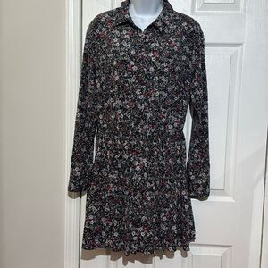 Button down, collared, v-neck, long sleeve, button cuff, drop waist, ruffled, floral print