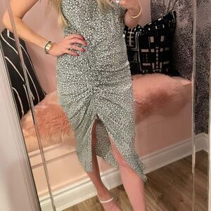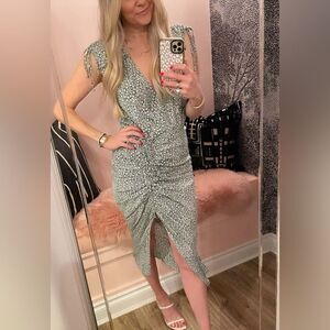 Veronica Beard Teagan faux wrap ruched silk dress in blue and white micro floral print. Features, flutter sleeves and hem, V neckline, ajustable side ruching with zipper from waist to below hip and attached lining.