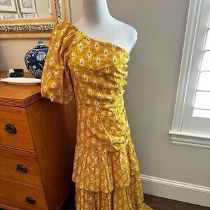 Special summer occasions, like garden parties or weddings, call for Veronica Beard's Virginia maxi dress. Made from floral-printed yellow cotton and silk, it has a slim-fit bodice with ruching along the sides, as well as a dropped waist with a tiered skirt.