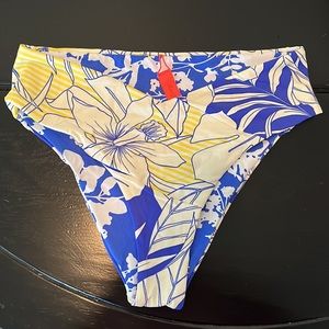 Double your swim style with Vacation Veronica! It features a tropical Maaji print on the outside then reverses to another surprise print on the inside for two unique looks. Made of stretch fabric this high waisted bikini bottom has v-shaping in front and comes in our cheeky cut.