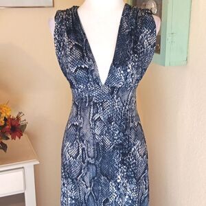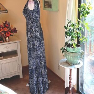 This maxi is soft and comfortable. The reptile print is subtle and blue. Ruched at wide shoulder straps. A tie at the back bridges a deep back. Pull over. Size XS , showing on my size 6 mannequin, measures 36 at chest, 24-28 at waist, 38 at hips, 27.5 inch slits at side seams. 59 long from shoulder to hem. Beautiful and comfortable.