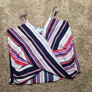 Veronica M contemporary blouse. Adjustable spaghetti straps. V-neck style. Elastic in the back. Loose fit. Textured fabric. Stylish tank top with vibrant stripes. Features a wrap design. Perfect for casual outings. Good preowned condition