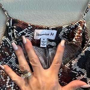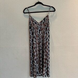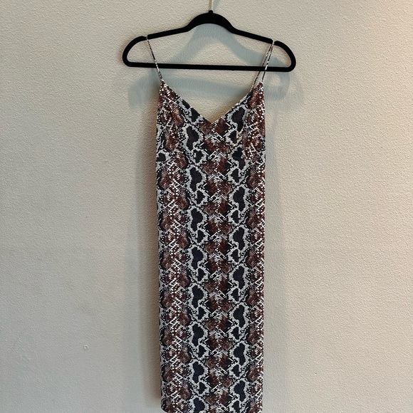 Chic midi dress with a striking pattern. Features a stylish brown and black design. Perfect for versatile wear. Size Medium