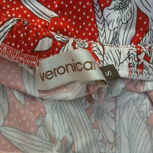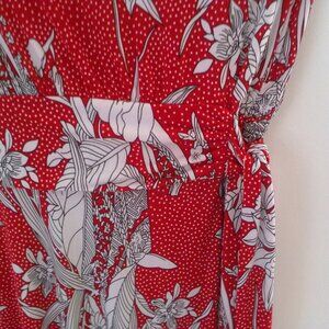 Striking Veronica M pull on drop waist maxi dress in red featuring an all over white floral pattern. Dress has a strapless, elastic bandeau design bodice and ties at the waist. Excellent condition. Material: 96% polyester/4% spandex. Dress is a size small, but has a lot of stretch to it and can easily fit a medium size (which is what I wear). Measurements: from top of bodice to hemline, 53"L; waist, 14"W; hips, 19.5"W.