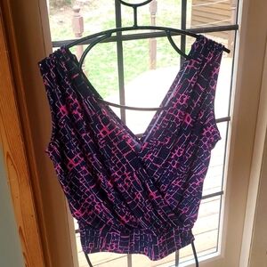 Stylish sleeveless top featuring a vibrant pink and blue pattern. Perfect for casual outings or a night out. Check out all pics for details and approximate measurements.