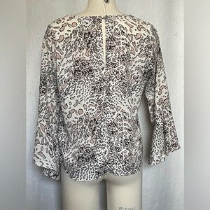 Bell sleeve. Self tie at waist. Button closure at nape of neck. Comes with extra button. Cream, tan and dark brown.
