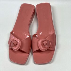 Retro-inspired jelly sandals with an oversized buckle at the vamp.