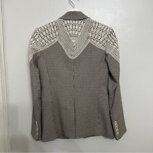 An intricate crochet overlay adds femininity to this tailored check blazer.