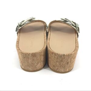 Round open toe, wide band upper, buckle detail, slide style & wedge cork heel
