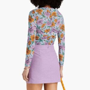 Feminine and flattering, the Veronica Beard Myrna top features a romantic ruched bodice with dramatic center-front gathering, mirrored along the back and both side seams in sheer mesh with a bold floral print. The design showcases a mix of oversized poppy-style flowers in warm orange and soft lavender tones, layered over a pale sky blue background. Long sleeves and a fitted silhouette give it an effortlessly polished feel, perfect for layering or wearing solo. Pair with high-waisted trousers or denim for a chic day-to-night look.