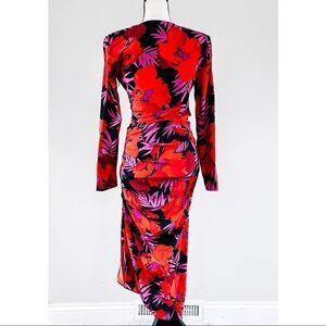 Say hello to this seriously flattering Veronica Beard dress styled with a flirty V-neckline, ruched bodice, and alluring floral pattern. Red and purple floral printed silk spandex (93% Silk, 7% Spandex). Sheath. Long sleeves. V-neckline.