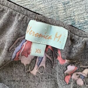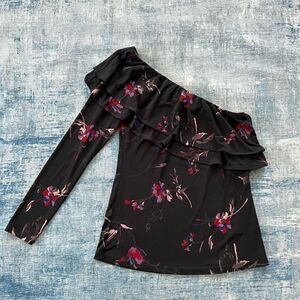 From Veronica M, this asymmetrical one shoulder/sleeve top features a floral pattern and double ruffled yoke.