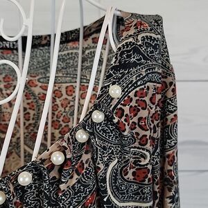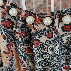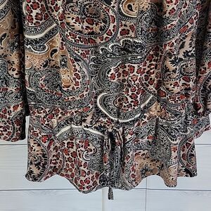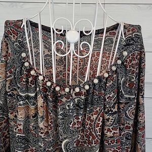 Vintage Veronix casual blouse in an artistic paisley print with a dropped waistline with drawstring tie creating a ruffled hemline, pearl embellished neckline, and long sleeves with cuffs. Great pre-owned condition.