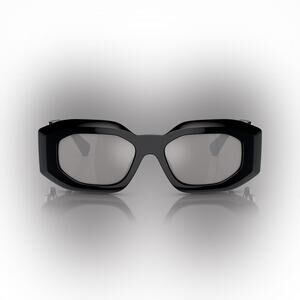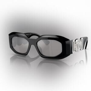 The Versace VE4425U sunglasses redefine luxury eyewear with an exquisite balance of glamour and craftsmanship. Designed in Italy, these striking shades feature an irregular frame shape in polished black nylon, accented by the signature Medusa motif adorned with sparkling crystals on both temples. The light grey mirror silver lenses add a captivating reflective finish, while delicate crystal embellishments on the upper right lens elevate this pair to true statement status. Perfect for those who appreciate sophistication with an edge.