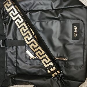 Brand New Versace Backpack. Backpack carry or shoulder carry with additional strap. Call out, one tooth on zipper is broke (still zips) and there is a small minor blemish on strap.