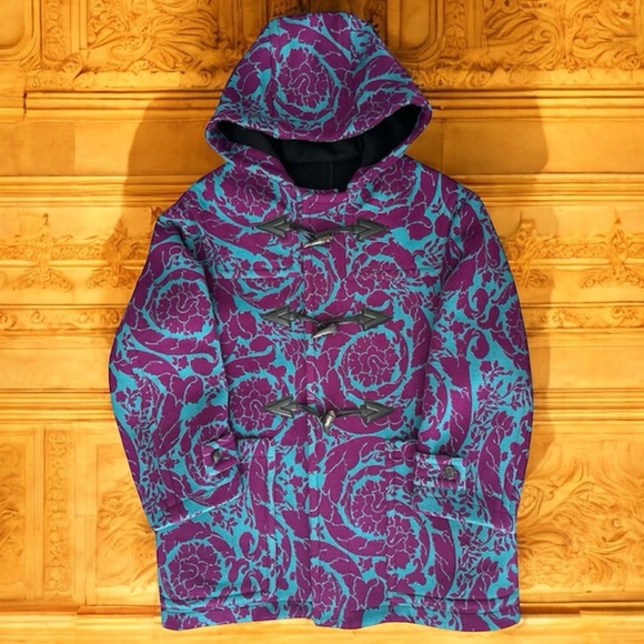 Versace hooded wool coat. Size 48. Missing embellishment on middle button, otherwise in excellent condition.
