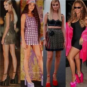 The shoes are the classic "Medusa Aevitas" square-toe platform pumps in black satin. Gold plated with crysstal accent