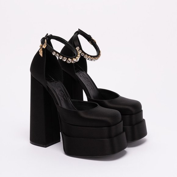 Versace Aevitas Satin Platform Pumps Ankle Strap Medusa Charm Square Toe Chunky Heels 38.5