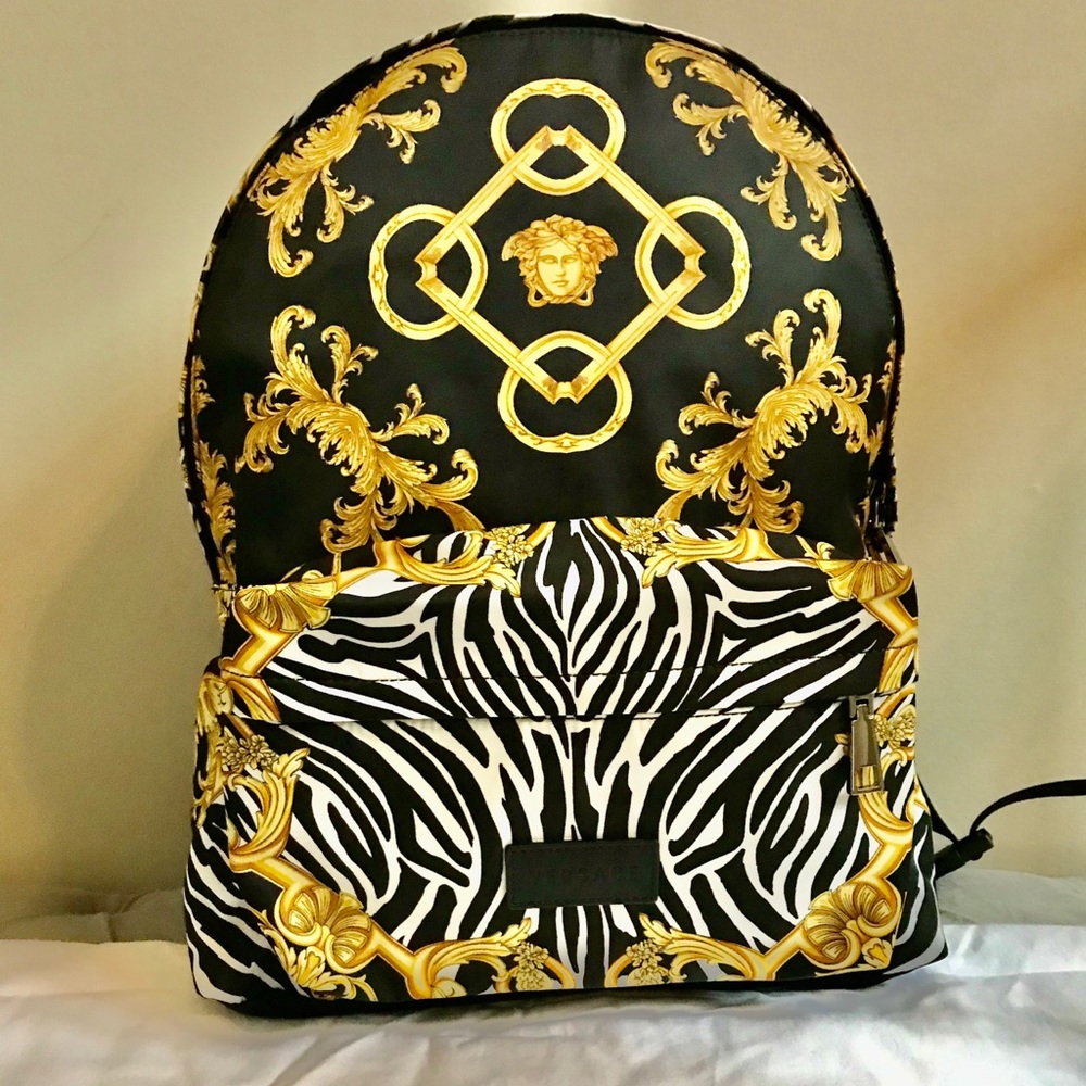 Versace black and gold baroque print backpack. Made in smooth nylon with black leather trims, it has a spacious main compartment with an inner zipped pocket and a zipped front pocket. There are adjustable padded straps and a black leather top handle. Comes with cards and dust bag. Only worn a few times like new this bag will be a great addition to your collection.