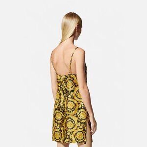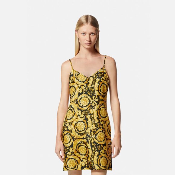 Authentic Versace. New with tags. Crafted from silk twill, this pajama slip dress features an all-over gold and black Barocco print. Ideal for luxurious evenings. Sleeveless. Shoulder straps. 100% Silk. Versace size 5 is equivalent to XL.