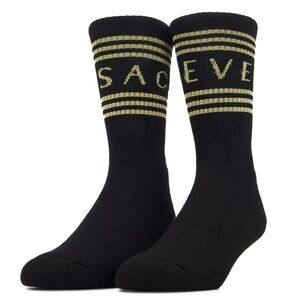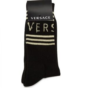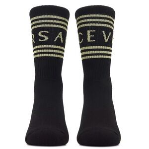 Versace socks in black with gold accents. Crew length socks featuring a prominent Versace logo. Ribbed cuff for a secure fit. Made of cotton and elastane for comfort, flexibility and a reinforced toe and heel for durability. Made in Italy. Unisex. New with tags.