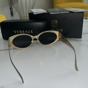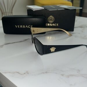 🔥These Versace sunglasses feature a sleek black frame adorned with a luxurious gold-toned emblem on the temples, offering a sophisticated and stylish accessory for any occasion.🗣️NWOT! These have a little weight to them due to the All Metal gold lining within the frames 🔥🔥Comes with everything in the pictures 💕. All Sales Are Final‼️