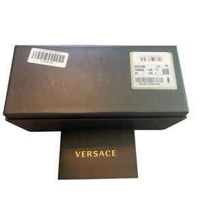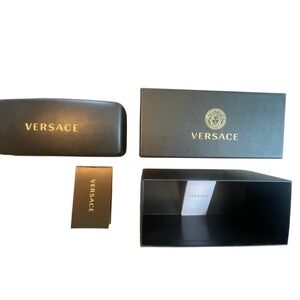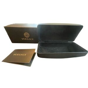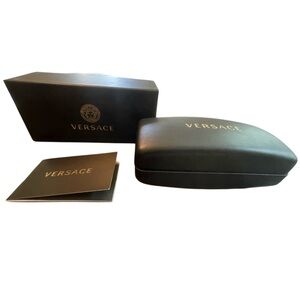 Like New! Versace Black Hard Shell Glasses/ Sunglasses Case and Cleaning Cloth. Original box in perfect condition. Rectangle shaped case with hinged closure. Gold debossed logo on the top. Sott black lining with silver debossed logo. New, unused black cleaning cloth included.