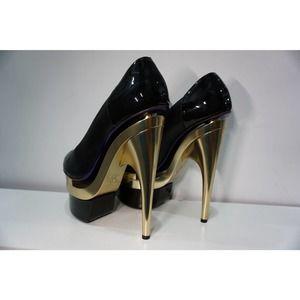 Versace Black Gold Triple Platform Leather Pumps Sky High Heel Shoes 41- RARE