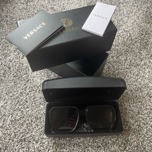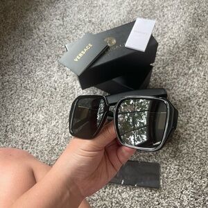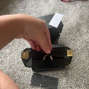 Elegant square sunglasses with gold detailing. Iconic Versace emblem on the side.
