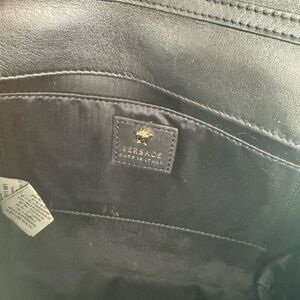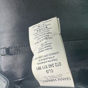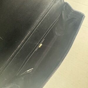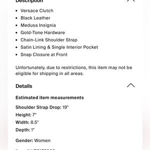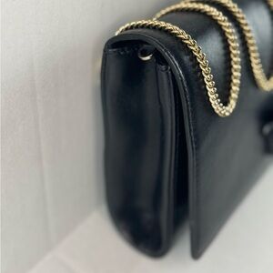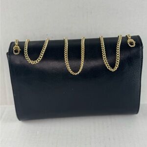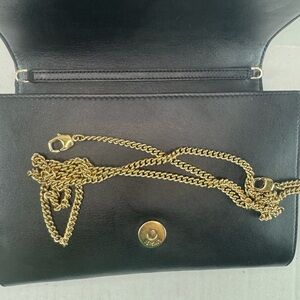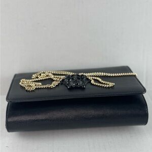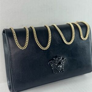 This luxurious Versace crossbody bag features a sleek black leather design adorned with a striking gold Medusa head logo. The elegant gold chain detailing adds a touch of sophistication, making it a versatile accessory for any occasion this gorgeous bag outside leather some scratches Medusa head little wiggle crossbody gold chain very shiny not faded inside little dirty other.
