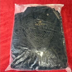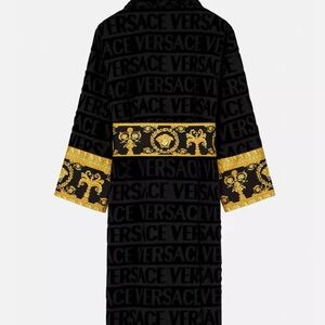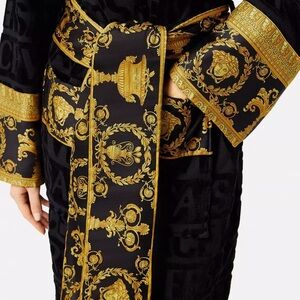 Luxurious black robe with gold baroque accents. Iconic Versace design.