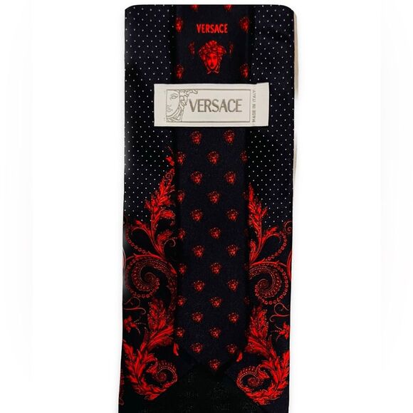 This exquisite tie features a striking black base adorned with intricate red baroque patterns, creating a sophisticated look. The design is concentrated at the wider bottom section, offering a bold statement that gradually fades as it ascends. Crafted from a textured fabric, this accessory adds a touch of elegance to any formal ensemble.
