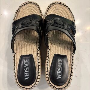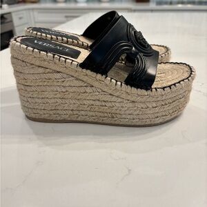 Versace Medusa wedge slides. Black leather straps. Tan woven sole.