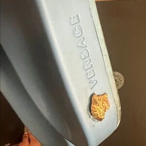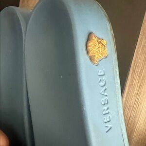 Elegant blue slides featuring a bold yellow Versace logo. Perfect for casual wear.