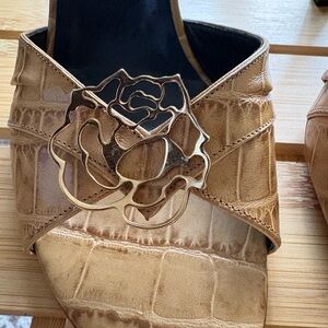Chic Versace mules in brown croc-embossed leather. Adorned with a gold floral design. Ideal for fashionable events.