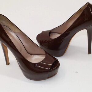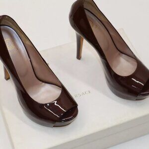 Versace Burgundy Pumps Peep Toe Patent Leather Platform Heels Size 37.5/US 7.5