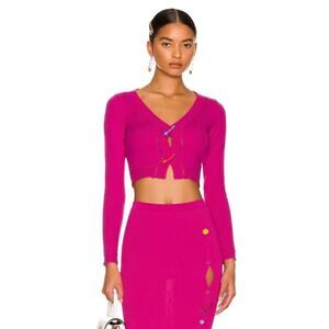 This luxurious Versace cropped cardigan is crafted from 100% cashmere and features the house’s iconic gold-tone safety pin embellishments at the front. A bold V-neckline, ribbed trim, and cut-out detailing enhance its signature edgy-luxe aesthetic. Long sleeves and a rich green hue make this a standout layering piece. Made in Italy with premium craftsmanship and high-fashion appeal, this piece blends iconic design with cozy sophistication.