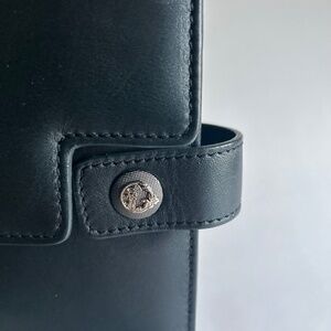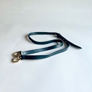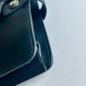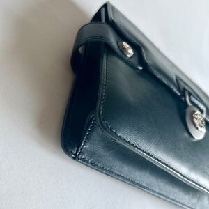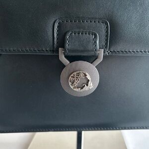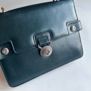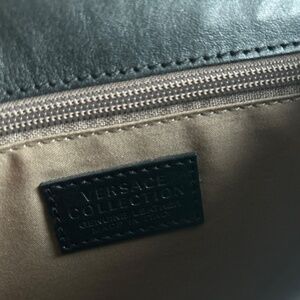 Versace Collecting Navy Genuine Leather Gold Chain Handbag Shoulder Bag. 9.2”W x 7.2”H x 2”D, gold metal chain handle drop 13”, adjustable shoulder strap 34”-37”, silver metal logos, magnetic snap closure, two pockets inside. In great condition, gently worn a few times. The metal of snap has scuffing and the leather has a small scuffing but no visible.