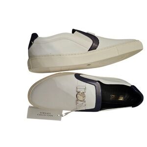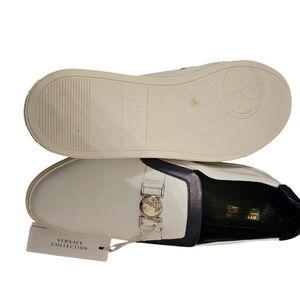 Versace Collection Medusa is a Detailed, round-toe slip-on style with elastic side goring. It has a leather lining and a lightly padded insole. The branded insole is made of white rubber, and the sole is 100% genuine leather. It does not include a box or dust box.